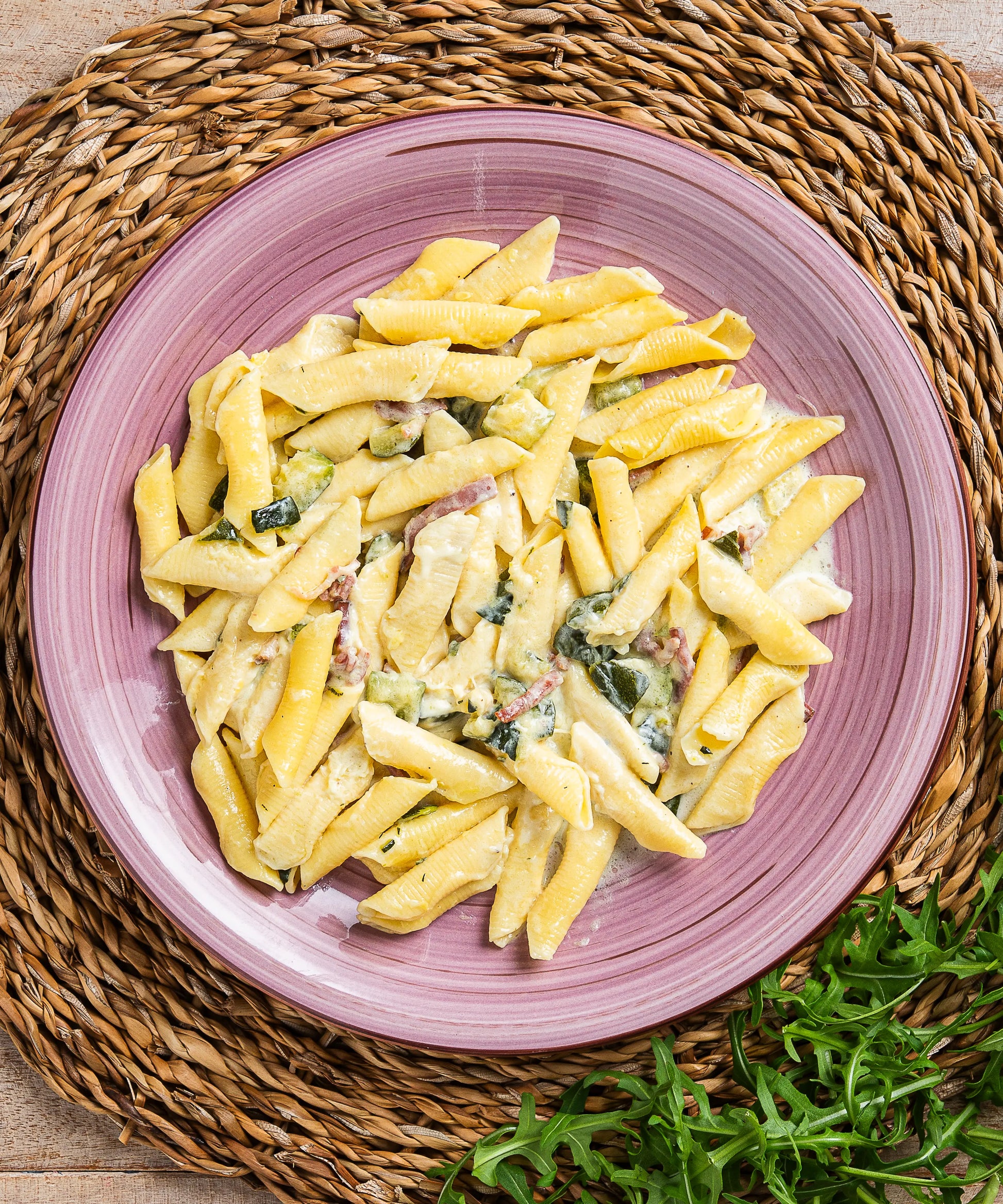 Panna (latte), Zucchine, Pasta all'uovo, Speck Alto Adige IGP, Grana Padano DOP, Sale, Pepe nero, Sale fino