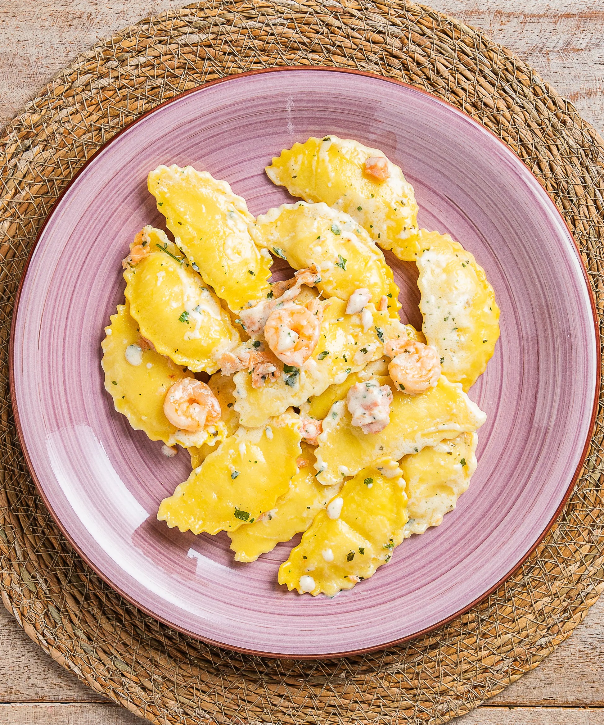 Panna (latte), pasta all'uovo (Semola di grano duro, uova fresche pastorizzate), Ricotta, Gamberi sgusciati, Salmone Norvegese affumicato, Sale, Farina di frumento tipo 00, Sale, Prezzemolo, Pepe nero, Cipolla, Olio extra vergine di oliva, Farina di grano tenero, Rosmarino, Aglio