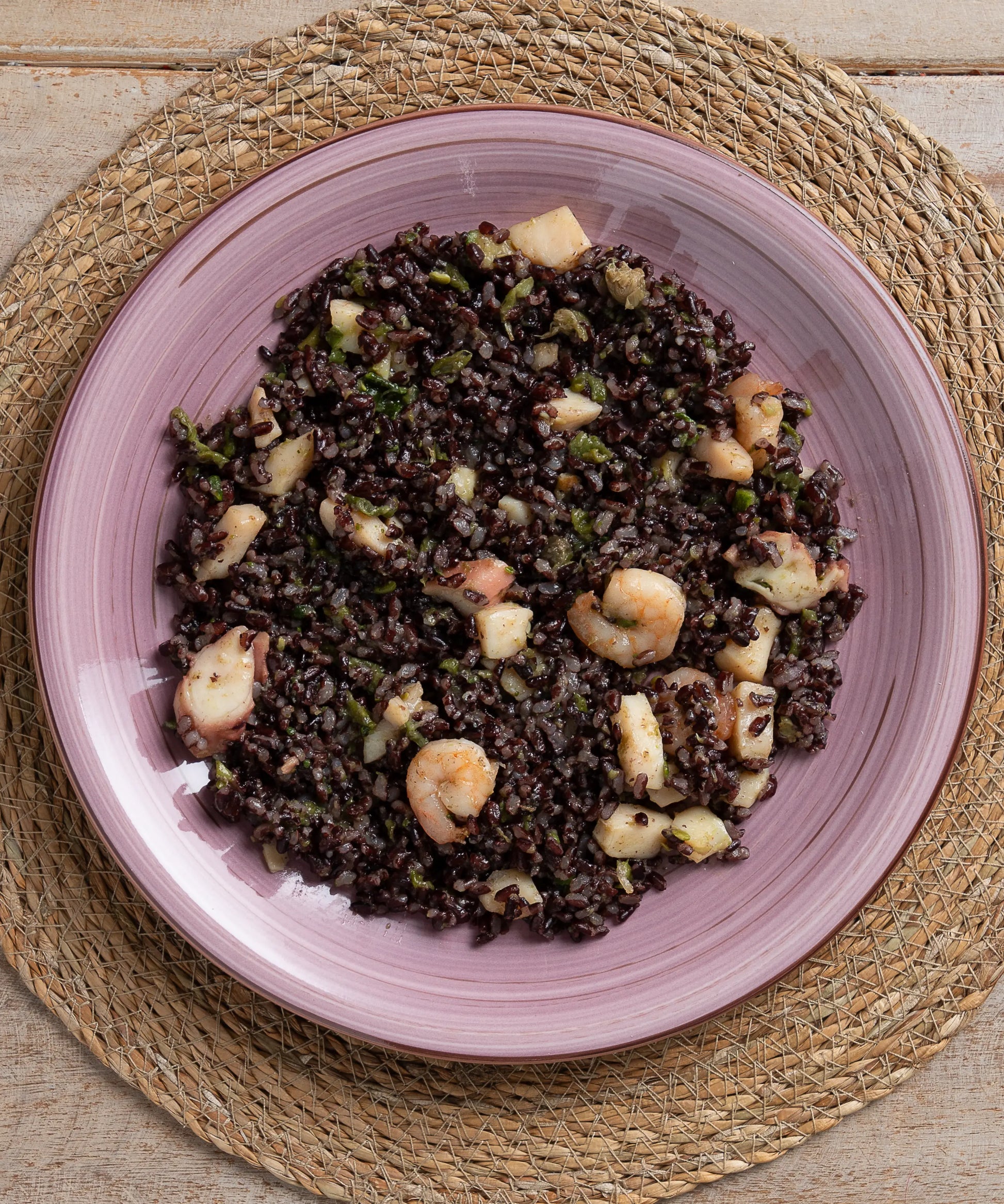 Calamari, Gamberi sgusciati, Riso Nero integrale, Totano, Zucchine, Fagiolini, Olio extra vergine di oliva, Capperi, Erba cipollina, Sale