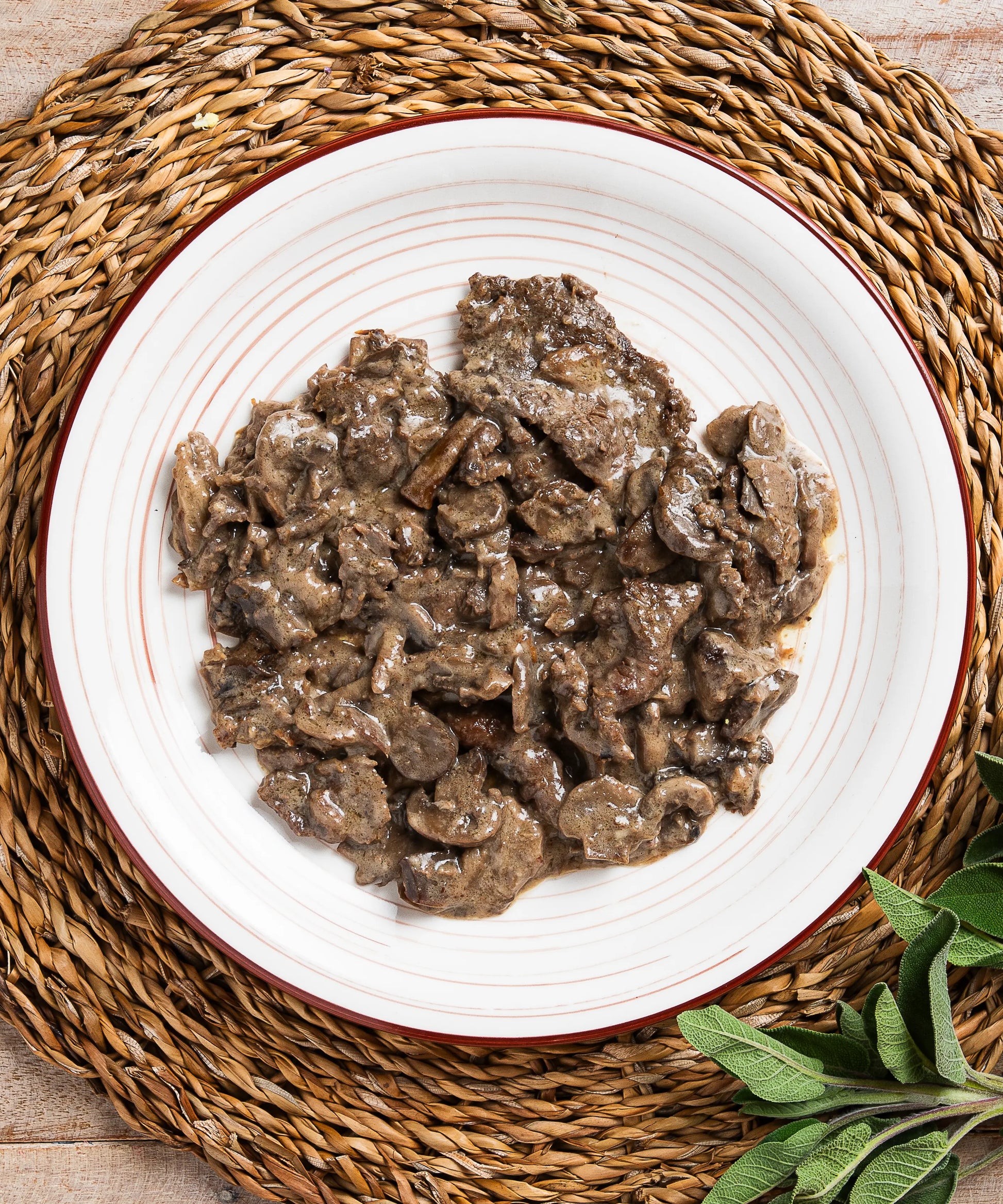 Carne fresca di bovino, Champignons funghi trifolati, Funghi Porcini, Panna (latte), Farina di grano tenero, Olio extra vergine di oliva, Pepe nero, Sale, Prezzemolo, Aglio, Olio di semi di girasole.