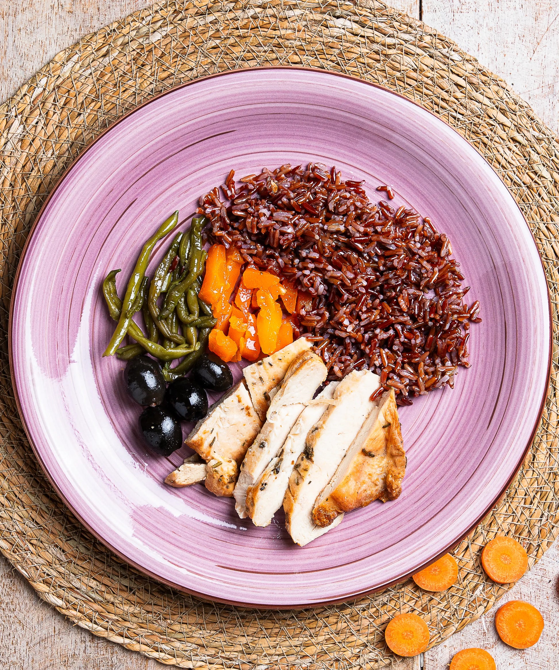 Riso Rosso Integrale, Fagiolini, Petto di Pollo, Carota, Olive nere, Olio extra vergine di oliva, Olio di semi di girasole, Rosmarino, Sale